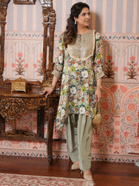 Floral Chinon kurta with lining and crepe salwar, featuring an embellished neckline,cuffs. A graceful blend of comfort and festive elegance.